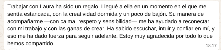 “Me ha parecido excelente, el trato de Laura tan cercano, transparente y profesional. Me ha ayudado muchísimo en la clarificación de conceptos para empezar con el desarrollo de mi marca personal de una manera super potente. Además de un umbral para labrar los cimientos de mi camino artístico, allí donde me encontraba perdida apareció como una luz, lo recomiendo tremendamente.”